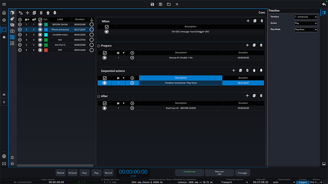 Gaël Martinet : The Cue Sequencer we have integrated allows several timelines to be triggered in order to create a complete show. Cues can be triggered via OSC, MIDI or by a sequence, while assigning them actions and chaining options to recall objects, snapshots and control parameters. They only handle audio. Of course, there is no problem synchronising it with an external Cue Sequencer to handle the other media. SPAT is now a strong solution for building a self-contained show-control system.