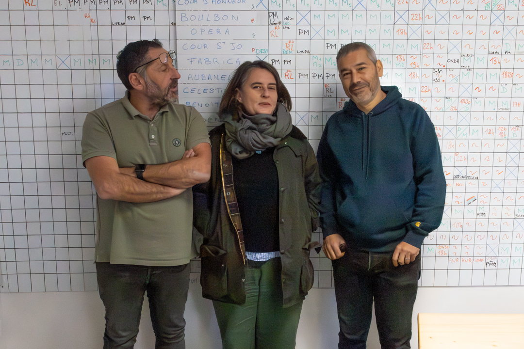 The organizing head of the technical team of the Avignon Festival with (from left to right) Philippe Roussel, technical director, Manuella Mangalo, general lighting stage manager, and Daniel Pires, general sound stage manager.